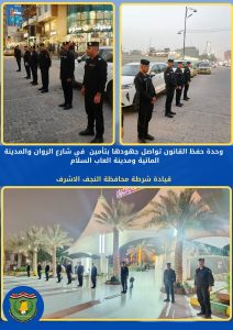 أعلنت قيادة شرطة محافظة النجف الأشرف عن استمرار جهود وحدة حفظ القانون في تنفيذ واجباتها الأمنية ضمن عدد من المواقع الحيوية في النجف الأشرف شملت شارع الروان المدينة المائية ومدينة ألعاب السلام وذلك ضمن الجهود المتواصلة لتعزيز الأمن والاستقرار وتأمين المناطق الحيوية والخدمية.